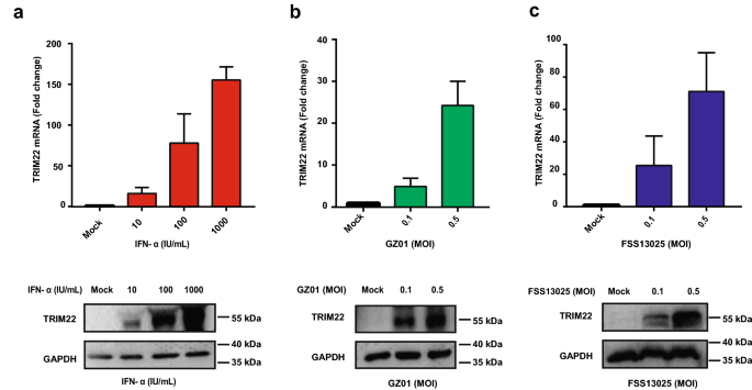 本环节的实验目的是确认TRIM22是否为I型干扰素诱导的ISG,且在寨卡病毒感染后可被显著上调。方法细节为,采用不同剂量(10、100、1000 IU/mL)的IFN-α处理A549细胞,或用GZ01、FSS13025两种寨卡病毒株感染A549细胞,处理后24小时收集细胞,通过实时荧光定量聚合酶链式反应(qRT-PCR)检测TRIM22的mRNA水平,免疫印迹(Western blot)实验检测蛋白表达水平。结果解读显示,IFN-α处理后TRIM22的mRNA和蛋白水平呈剂量依赖性显著上调(n=3,P<0.01);两种寨卡病毒株感染后,TRIM22的mRNA和蛋白水平也显著升高,同时其他ISGs如MX1、IDO1、RSAD2的表达也同步上调,证明TRIM22是寨卡病毒感染诱导的ISG。实验所用关键产品:兔抗TRIM22抗体(NOVUSBIO)、小鼠抗GAPDH抗体(COBIO)、One Step PrimeScript RT-PCR kit(Takara)、SYBR Green qPCR mix(TransGen Biotech)。