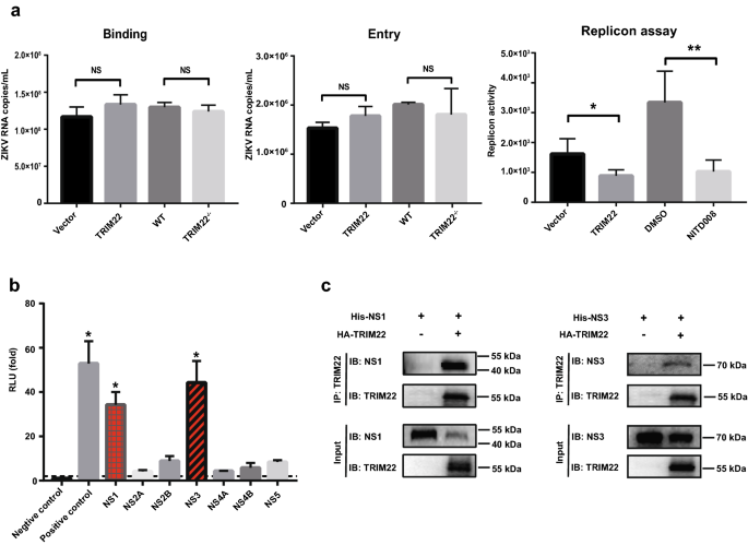本环节的实验目的是确定TRIM22靶向的寨卡病毒蛋白,明确其作用于病毒生命周期的具体阶段。方法细节为,首先进行病毒结合与进入实验,检测TRIM22是否影响寨卡病毒感染的早期阶段;随后使用编码寨卡病毒7种非结构蛋白及Renilla荧光素酶报告基因的亚基因组复制子系统,检测TRIM22对病毒RNA复制的影响;采用双分子荧光互补(BiLC)实验筛选TRIM22与寨卡病毒非结构蛋白的相互作用,再通过免疫共沉淀(Co-IP)实验验证,免疫荧光实验检测两者的细胞内共定位。结果解读显示,病毒结合与进入实验表明TRIM22不影响寨卡病毒感染的早期阶段,而复制子实验显示过表达TRIM22可显著降低病毒RNA的复制活性(n=3,P<0.001);BiLC实验显示TRIM22与寨卡病毒的NS1和NS3蛋白特异性相互作用,Co-IP实验进一步验证了这一相互作用,免疫荧光实验显示TRIM22与NS1、NS3在细胞内共定位,证明TRIM22通过作用于病毒复制阶段的NS1和NS3蛋白发挥抗病毒功能。实验所用关键产品:BiLC慢病毒载体,免疫共沉淀实验使用Cytobuster Protein Extraction Reagent(Sigma)、抗HA标签抗体(COBIO)、抗His标签抗体(CST)。