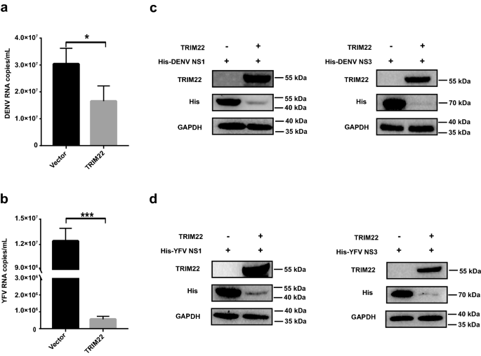 本环节的实验目的是拓展TRIM22的抗病毒谱,验证其对其他蚊媒黄病毒的抑制作用。方法细节为,在A549细胞中过表达TRIM22或空载体,12小时后以MOI=0.01的登革病毒(DENV-2)或黄热病毒(YFV 17D)感染细胞,24小时后通过实时荧光定量PCR检测细胞内的病毒RNA水平;在HEK293T细胞中共表达TRIM22与DENV或YFV的NS1、NS3蛋白,免疫印迹实验检测病毒蛋白的表达水平;使用TRIM22敲除细胞感染YFV,检测病毒复制水平。结果解读显示,过表达TRIM22可显著抑制DENV和YFV的RNA复制(n=3,P<0.01);TRIM22同样可降解DENV和YFV的NS1和NS3蛋白;TRIM22敲除细胞中YFV的复制水平较野生型细胞显著增强,证明TRIM22对蚊媒黄病毒具有广谱抗病毒作用。实验所用关键产品:DENV-2(43株)、YFV 17D株,实时荧光定量PCR实验使用对应病毒的特异性引物。