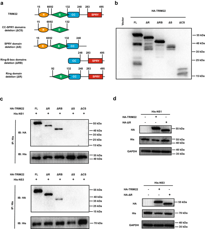 本环节的实验目的是明确TRIM22调控寨卡病毒NS1和NS3蛋白的分子机制。方法细节为,在HEK293T细胞中共表达TRIM22与NS1或NS3蛋白,免疫印迹实验检测病毒蛋白的表达水平;采用不同剂量(0、250、500、1000 ng)的TRIM22质粒共转染,检测其对病毒蛋白的剂量依赖性降解作用;使用蛋白酶体抑制剂MG132处理细胞,验证TRIM22介导的降解是否依赖蛋白酶体通路;共表达TRIM22、泛素与NS1或NS3蛋白,检测病毒蛋白的泛素化水平;构建TRIM22的截短体(缺失Ring结构域或SPRY结构域),通过免疫共沉淀和免疫印迹实验分别检测其与病毒蛋白的相互作用及降解功能。结果解读显示,过表达TRIM22可剂量依赖性降低NS1和NS3的蛋白水平;MG132处理可完全逆转TRIM22介导的NS1和NS3降解;TRIM22过表达显著增强NS1和NS3的泛素化水平,且为K48连接的泛素化修饰;截短体实验显示,TRIM22的SPRY结构域是与NS1、NS3相互作用的关键区域,而Ring结构域则是介导病毒蛋白泛素化降解的必需结构域,证明TRIM22作为功能性E3泛素连接酶,通过K48泛素化修饰介导NS1和NS3的蛋白酶体降解。实验所用关键产品:蛋白酶体抑制剂MG132(Sigma-Aldrich),泛素化实验使用pHA-ubiquitin质粒、pHA-K48质粒。