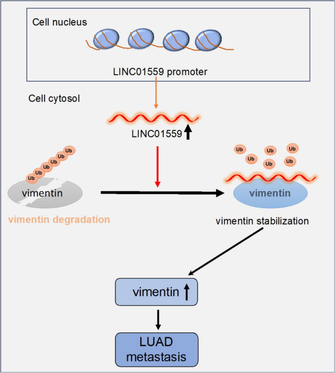 核心成果方面,LINC01559作为肺腺癌的独立预后Biomarker,可有效区分高风险转移患者,为临床预后分层提供新的指标;同时,其通过结合波形蛋白阻断泛素化降解的机制首次被揭示,为肺腺癌转移的治疗提供了新的潜在靶点。此外,该研究首次将LINC01559与波形蛋白的调控关联起来,拓展了长链非编码RNA调控蛋白泛素化的研究领域,具有重要的学术价值。