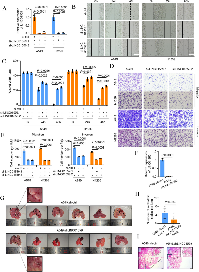 实验目的:在细胞和动物水平验证LINC01559对肺腺癌迁移、侵袭及转移能力的调控作用。