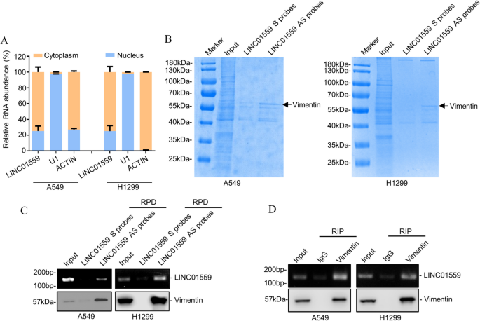 实验目的:鉴定LINC01559的亚细胞定位及互作蛋白,明确其与波形蛋白的直接结合关系。
