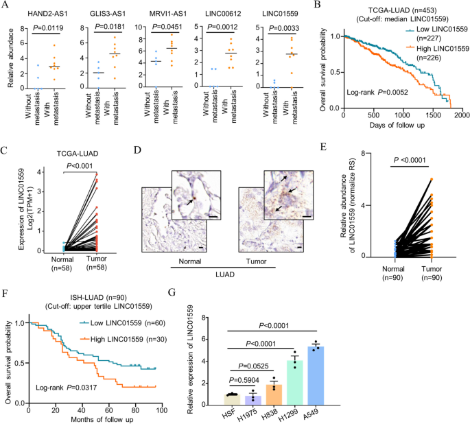结果解读:数据库分析显示,LINC01559在伴有远处转移的肺腺癌组织中表达显著高于无转移组织(TCGA数据集n=453,P<0.05),且肺腺癌组织表达显著高于配对癌旁组织(TCGA数据集n=58,P<0.01);原位杂交验证结果显示,90例临床样本中肺腺癌组织LINC01559的反应评分(RS)显著高于癌旁组织(n=90,P<0.01),高表达与更高的组织学分级(III-IV级)和晚期(AJCC III-IV期)相关;Kaplan-Meier分析显示高表达LINC01559的患者总生存期更短(n=90,P<0.01),多因素Cox回归分析证实其为独立预后因素;细胞系实验显示,3种肺腺癌细胞系中LINC01559表达显著高于成纤维细胞系(n=3,P<0.05)。