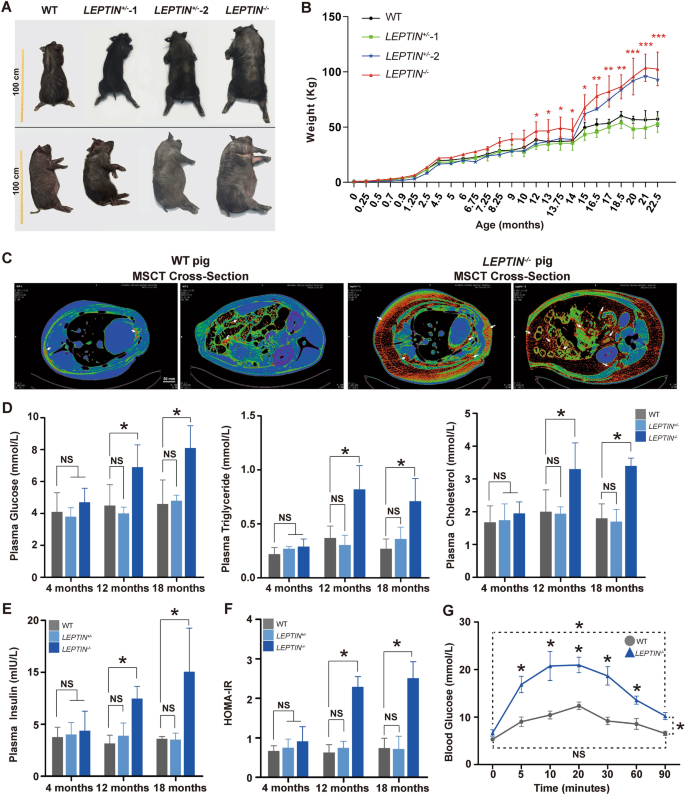 结果解读:Leptin缺陷猪的Leptin蛋白表达几乎完全缺失;21月龄时体重达到103.75±12.37 kg,约为野生型猪的2倍(n=3,P<0.001);MSCT显示皮下和内脏脂肪厚度及占比均为野生型的3倍以上;12月龄时血糖、甘油三酯、总胆固醇、胰岛素水平显著升高(n=3,P<0.05),HOMA-IR提示胰岛素抵抗,IVGTT显示注射葡萄糖后10分钟血糖升至近20 mmol/L,90分钟后仍未恢复至初始水平,符合人类肥胖及2型糖尿病的临床特征。