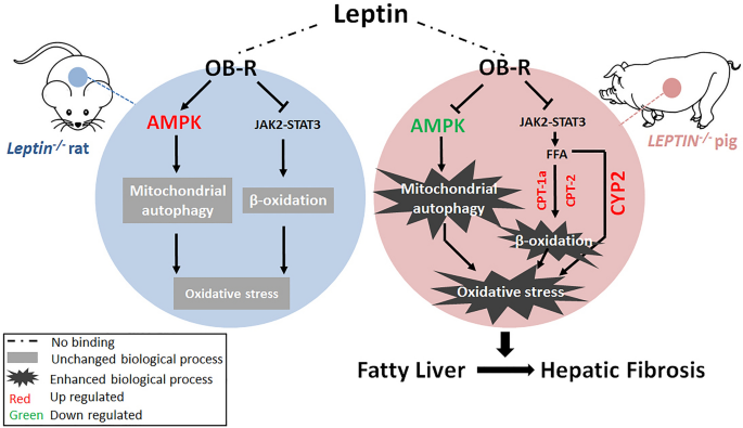 现有研究中,啮齿类Leptin缺陷模型(如ob/ob小鼠、Zucker大鼠)因成本低、繁殖周期短,被广泛用于肥胖、代谢综合征及脂肪肝的研究,其优势在于能快速模拟能量代谢紊乱和脂肪肝表型,但局限性在于无法自发进展为肝纤维化,与人类NAFLD的完整病理进程存在较大差异。现有研究已证实Leptin通过JAK2-STAT3通路调控糖脂代谢,AMPK通路参与糖异生、自噬及氧化应激的调控,但不同物种中Leptin缺失对AMPK通路的激活状态及对肝纤维化的调控作用尚未明确,这一空白限制了NAFLD治疗靶点的开发。本研究的创新价值在于,首次构建了能模拟人类NAFLD全病程的Leptin缺陷猪模型,弥补了啮齿类模型的不足;通过对比猪与大鼠模型的通路差异,明确了AMPK通路在不同物种中的调控差异,揭示了AMPK失活通过线粒体自噬和氧化应激促进肝纤维化的机制,为NAFLD的机制研究和治疗靶点开发提供了新的视角。
