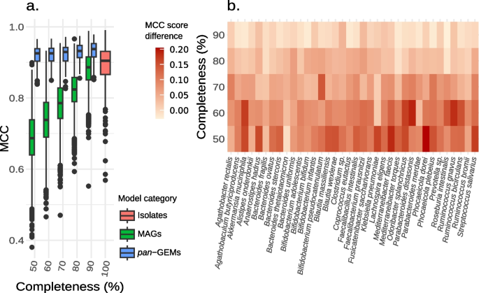 结果解读:MAG完整性与MCC呈显著正相关(Spearman相关系数rho=0.78,P<2.2e-16),说明MAG完整性越低,构建的GEMs与参考模型的差异越大;部分未培养物种的MAGs最高完整性不足90%,其构建的GEMs存在大量代谢缺口,进一步验证了单MAG策略的局限性。