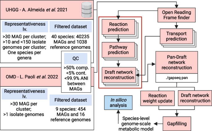 文献英文标题:pan-Draft: automated reconstruction of species-representative metabolic models from multiple genomes;发表期刊:Genome Biology;影响因子:未明确提供;研究领域:微生物代谢组学、宏基因组学,聚焦宏基因组组装基因组(MAGs)的物种水平基因组尺度代谢模型(GEMs)构建。