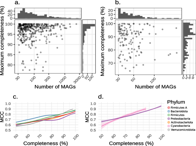 方法细节:利用gapseq工具构建单MAG的GEMs(MAG-GEMs)和参考基因组的GEMs(iso-GEMs);通过计算MAG-GEMs与iso-GEMs反应组的Matthews相关系数(MCC)评估模型质量;拟合广义加性模型分析MAG完整性与MCC的相关性。