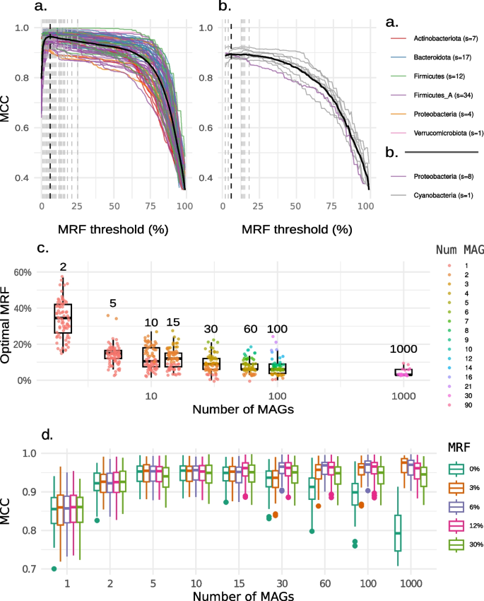 研究过程详述:Biomarker的来源为宏基因组组装基因组(MAGs)的代谢模型,验证方法为将筛选得到的核心反应组与参考基因组的反应组进行比较,计算Matthews相关系数(MCC)评估准确性;特异性与敏感性数据显示,6%的MRF阈值下,pan-GEMs与参考模型的MCC最高,能有效排除污染反应(频率<6%的反应多为污染或附属代谢反应),同时保留90%以上的核心代谢反应;当MAG数量≥30时,该阈值的特异性和稳定性最佳。