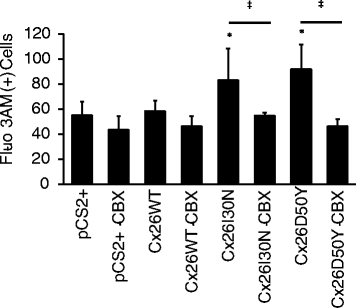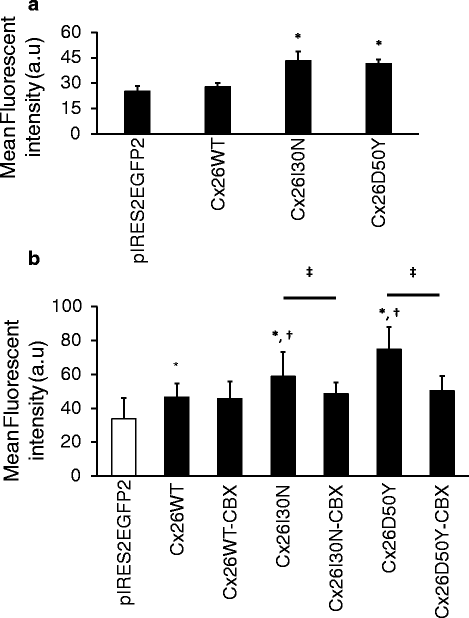 实验目的是构建表达野生型(WT)及突变型Cx26的哺乳动物细胞模型,为后续功能检测提供基础。方法细节:通过定点诱变技术从人野生型Cx26 cDNA中构建I30N和D50Y错义突变体,将WT及突变体cDNA克隆至pIRES2EGFP2和pCS2+哺乳动物表达载体,测序验证突变位点;选用间隙连接通讯缺陷的HeLa细胞和N2A细胞,采用Lipofectamine 2000试剂按1:2的DNA-转染试剂比例进行转染,转染后添加3.2mM CaCl₂以预防半通道活性导致的细胞死亡,转染后24-48h用于后续实验。结果解读:成功获得稳定表达Cx26 WT、I30N及D50Y的细胞模型,为后续蛋白定位、半通道活性及钙水平检测提供了可靠的实验体系。产品关联:实验所用关键产品:Lipofectamine 2000转染试剂(Invitrogen, USA)、Dulbecco改良Eagle培养基(DMEM, Thermo Scientific HyClone, USA)、胎牛血清(Biological Industries, Israel)等。