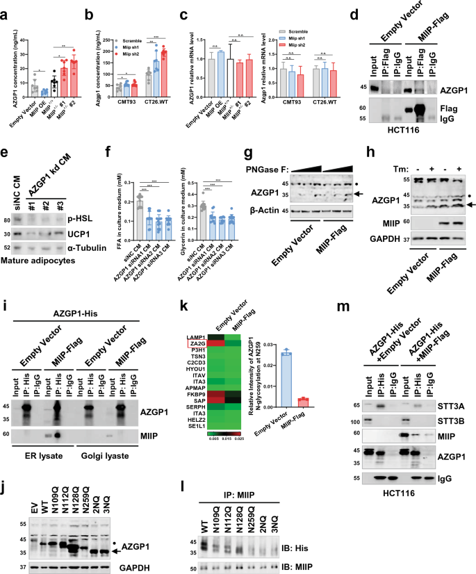 实验目的是阐明MIIP调控脂肪褐变的下游效应分子及机制。研究人员通过蛋白质组学分析MIIP+/−和野生型HCT116细胞条件培养基中的差异分泌蛋白,筛选出α-2-糖蛋白1锌结合蛋白(AZGP1);通过免疫共沉淀验证MIIP与AZGP1的相互作用;通过PNGase F处理、衣霉素处理分析AZGP1的糖基化状态;构建AZGP1的N-糖基化位点突变体,通过免疫共沉淀、LC-MS/MS分析MIIP对AZGP1糖基化的调控位点;通过免疫共沉淀分析MIIP与STT3A的竞争结合作用。结果显示,MIIP+/−细胞中AZGP1分泌显著增加;MIIP与AZGP1直接相互作用;MIIP过表达可降低AZGP1的N-糖基化水平,LC-MS/MS结果显示MIIP过表达使AZGP1第259位天冬酰胺的N-糖基化强度降低至对照组的0.149倍(n=3,P<0.01);MIIP与STT3A竞争结合AZGP1,抑制其N-糖基化和分泌;AZGP1敲低可逆转MIIP+/−细胞条件培养基诱导的脂肪褐变和脂解。