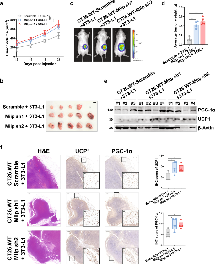 实验目的是在体内验证MIIP下调对结直肠癌与脂肪组织交互的调控作用。研究人员构建稳定敲低Miip的小鼠结直肠癌细胞系CT26.WT和CMT93,与3T3-L1脂肪细胞共注射到BALB/c或C57BL/6小鼠背部,建立皮下移植瘤模型;通过活体成像、肿瘤称重监测肿瘤生长;通过免疫组化、免疫印迹检测肿瘤组织中UCP1、CD36等蛋白的表达;构建HCT116 MIIP+/−与成熟脂肪细胞共注射的裸鼠模型,验证人源细胞的效应。结果显示,共注射Miip敲低细胞与脂肪细胞的小鼠肿瘤生长速度显著快于对照组,肿瘤体积和重量显著增加(n=5,P<0.001);肿瘤组织中UCP1表达显著升高,提示脂肪褐变增强;裸鼠模型中,MIIP+/−细胞与脂肪细胞共注射的肿瘤体积和重量显著大于单独注射组(n=5,P<0.01),且肿瘤组织中CD36、FABP4等游离脂肪酸转运蛋白表达显著升高。