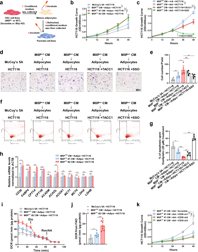 实验目的是明确脂肪褐变释放的游离脂肪酸对结直肠癌细胞的作用,并探索联合治疗策略。研究人员通过两步条件培养基处理,将脂肪细胞经MIIP+/−细胞条件培养基处理后,收集其条件培养基处理结直肠癌细胞,通过CCK-8、Transwell实验检测细胞增殖、侵袭能力;通过流式细胞术检测奥沙利铂诱导的细胞凋亡;使用游离脂肪酸转运抑制剂磺基琥珀酰亚胺油酸酯(SSO)、乳酸转运抑制剂7ACC1处理细胞,验证游离脂肪酸的作用;在动物模型中,使用奥沙利铂联合β-肾上腺素能受体抑制剂SR59230A或SSO处理,评估治疗效果。结果显示,两步条件培养基处理的结直肠癌细胞增殖、侵袭能力显著增强,奥沙利铂诱导的凋亡显著减少(n=5,P<0.01);SSO处理可显著逆转上述效应,而7ACC1作用较弱,提示游离脂肪酸是主要促癌因子;动物模型中,奥沙利铂联合SR59230A或SSO可显著抑制MIIP下调肿瘤的生长,肿瘤体积和重量显著低于单独奥沙利铂组(n=5,P<0.001)。