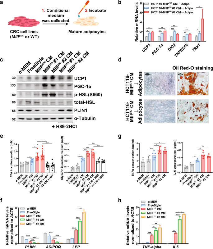 实验目的是验证MIIP下调的结直肠癌细胞是否能诱导脂肪细胞褐变和脂解。研究人员构建MIIP半合子缺失的HCT116细胞系(MIIP+/−),收集其条件培养基处理人原代脂肪干细胞分化的成熟脂肪细胞;通过实时荧光定量PCR检测脂肪褐变相关基因的表达,免疫印迹检测UCP1、p-HSL等蛋白的表达;通过油红O染色观察脂滴变化,检测培养基中游离脂肪酸和甘油的含量;使用PKA抑制剂H89-2HCl处理脂肪细胞,验证信号通路。结果显示,MIIP+/−细胞条件培养基处理的脂肪细胞中,褐变相关基因UCP1、PGC-1α等的表达显著上调(n=6,P<0.001);UCP1蛋白表达和HSL磷酸化水平显著升高,脂滴保护蛋白PLIN1表达降低;脂滴数量和体积显著减少,培养基中游离脂肪酸和甘油含量显著升高(n=8,P<0.001);H89-2HCl处理可逆转上述效应,提示MIIP下调通过cAMP-PKA通路诱导脂肪细胞褐变和脂解。