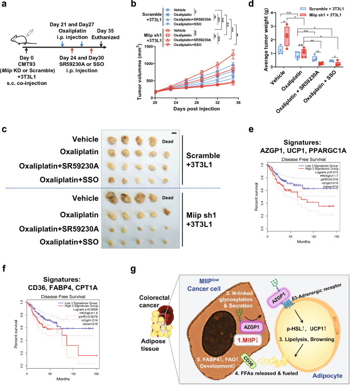 核心成果方面,MIIP作为结直肠癌的肿瘤抑制因子,其下调与癌周脂肪褐变及结直肠癌不良预后相关,临床样本分析显示低MIIP表达与肿瘤高恶性程度正相关;AZGP1作为MIIP的下游效应分子,首次被揭示在结直肠癌中通过N-糖基化调控分泌,介导肿瘤-脂肪交互;UCP1和CD36作为脂肪褐变和游离脂肪酸利用的Biomarker,其高表达与结直肠癌不良预后相关,GEPIA2数据库分析显示,脂肪褐变基因签名(AZGP1、UCP1、PPARGC1A)和游离脂肪酸转运氧化基因签名(CD36、FABP4、CPT1A)高表达的结直肠癌患者无病生存期显著缩短(P<0.05)。此外,研究证实奥沙利铂联合β-肾上腺素能受体抑制剂或游离脂肪酸转运抑制剂,可显著改善MIIP异常表达结直肠癌的治疗效果,为临床治疗提供新策略。