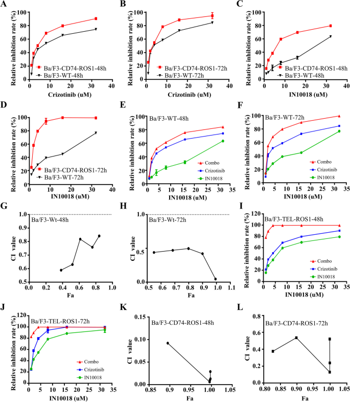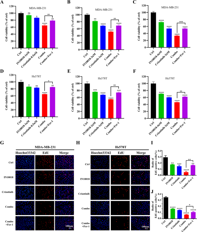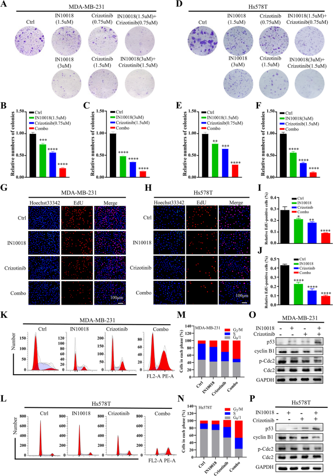 研究人员采用细胞活力实验检测不同浓度IN10018、克唑替尼单独及联合处理对MDA-MB-231、Hs578T细胞活力的影响,计算联合指数(CI)判断协同效应;通过克隆形成实验、EdU实验检测细胞增殖能力;流式细胞术检测细胞周期分布与凋亡率;蛋白免疫印迹检测细胞周期相关蛋白(cyclin B1、p-Cdc2、p53)与凋亡相关蛋白(BAX、Bcl-2、cleaved-Caspase-3等)的表达水平。同时,在Ba/F3-WT与Ba/F3-CD74-ROS1细胞中验证联合治疗的协同作用。