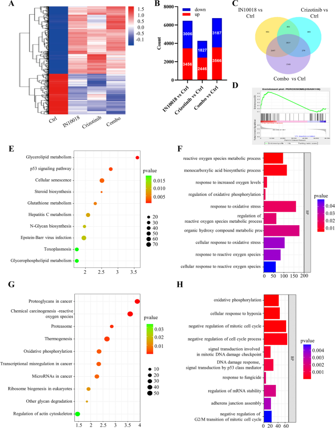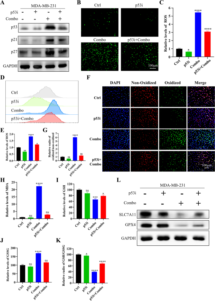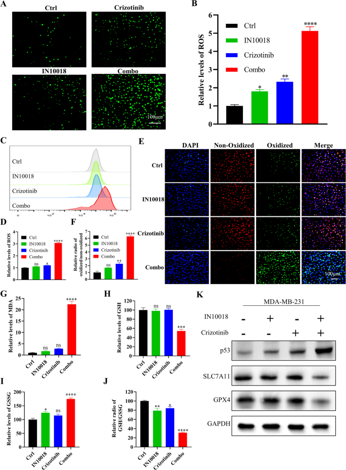 研究人员对IN10018、克唑替尼单独及联合处理的MDA-MB-231细胞与异种移植肿瘤组织进行RNA测序,分析差异表达基因(DEGs),进行GO与KEGG富集分析;采用免疫荧光与流式细胞术检测细胞内活性氧(ROS)水平;C11-BODIPY染色检测脂质过氧化水平;MDA试剂盒检测丙二醛含量;GSH试剂盒检测谷胱甘肽(GSH)与氧化型谷胱甘肽(GSSG)的含量,计算GSH/GSSG比例;蛋白免疫印迹检测铁死亡相关蛋白(SLC7A11、GPX4)与p53的表达;加入p53抑制剂Pifithrin-α,验证p53在联合治疗诱导铁死亡中的作用。