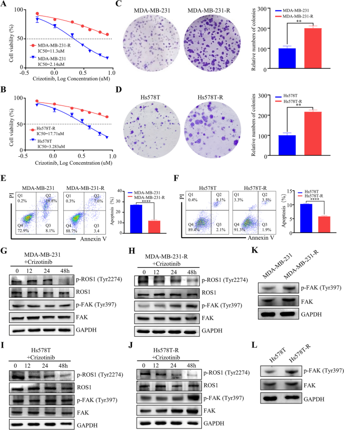 研究人员首先利用Timer数据库分析TNBC组织与癌旁正常组织中FAK、ROS1的mRNA表达水平,通过GSE数据库(GSE159956、GSE10885)分析FAK、ROS1表达与TNBC患者预后的相关性;随后通过逐步提高培养基中克唑替尼的浓度,连续培养4个月构建MDA-MB-231与Hs578T的耐药细胞系,采用细胞活力实验检测细胞对克唑替尼的敏感性,克隆形成实验检测细胞增殖能力,流式细胞术检测细胞凋亡率,蛋白免疫印迹(Western blotting)检测磷酸化FAK(p-FAK)的表达水平。