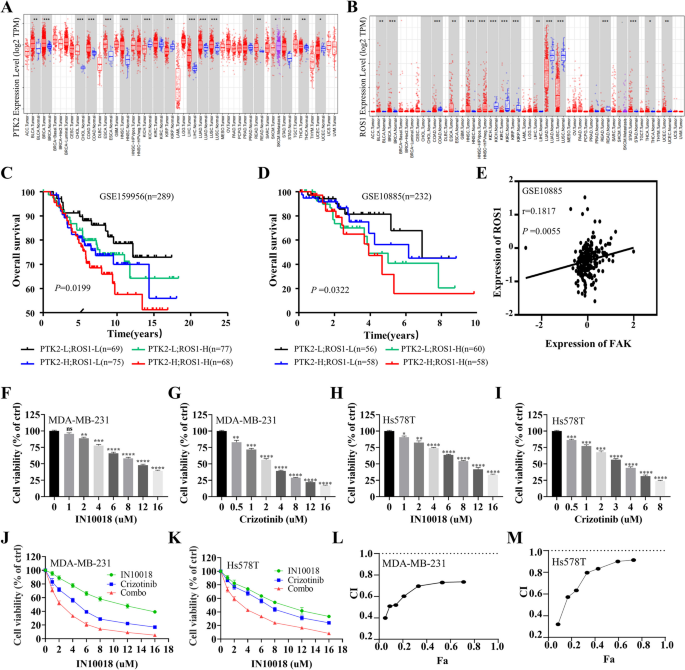 现有研究表明,TNBC的异质性是导致治疗困难的核心原因,针对特定分子亚型的靶向治疗可显著改善患者预后,如PARP抑制剂用于BRCA突变患者,ROS1抑制剂用于E-钙粘蛋白缺失患者,但这些治疗手段均存在耐药问题。ROS1抑制剂克唑替尼通过抑制ROS1激酶活性阻断下游MAPK、PI3K/AKT等通路,抑制肿瘤细胞增殖,但长期治疗后患者会出现耐药,其机制与FAK的激活相关。FAK作为一种非受体酪氨酸激酶,参与细胞黏附、增殖、凋亡等多种生物学过程,与多种肿瘤的化疗、靶向治疗耐药密切相关,FAK抑制剂可增强其他靶向药物的疗效,如与KRAS G12C抑制剂联用克服KRAS突变肿瘤的耐药。现有研究的技术方法优势在于通过数据库分析、细胞实验、动物模型验证了靶点的临床相关性与治疗潜力,但局限性在于多聚焦单靶点治疗,联合抑制FAK与ROS1的协同作用及机制尚未阐明,且缺乏更贴近临床的类器官模型验证治疗策略的转化潜力。