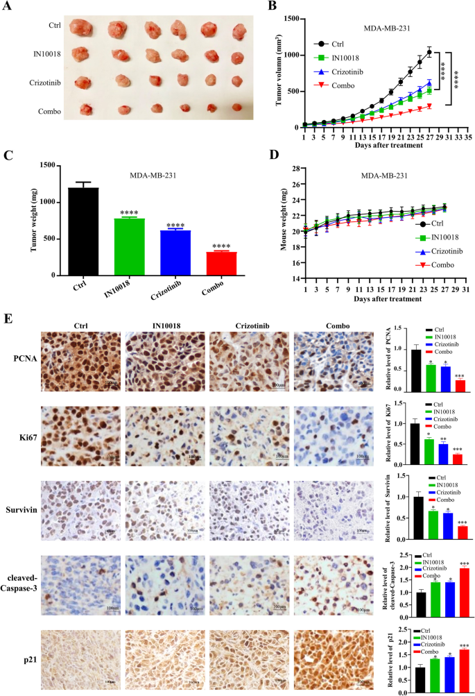 研究人员构建MDA-MB-231细胞的裸鼠异种移植模型,当肿瘤体积达到50-100 mm³时,将小鼠随机分为对照组、IN10018组(25 mg/kg,每日灌胃)、克唑替尼组(25 mg/kg,每日灌胃)、联合治疗组,每3天测量肿瘤体积与小鼠体重,实验结束后取肿瘤组织称重,进行免疫组化检测增殖相关蛋白(Ki67、PCNA)、凋亡相关蛋白(cleaved-Caspase-3、Survivin)与p21的表达。同时,收集人TNBC手术标本,构建类器官模型,通过HE染色与免疫组化验证类器官与原代肿瘤的一致性,采用CellTiter-Glo 3D检测不同处理组的细胞活力,计算CI值判断协同效应。