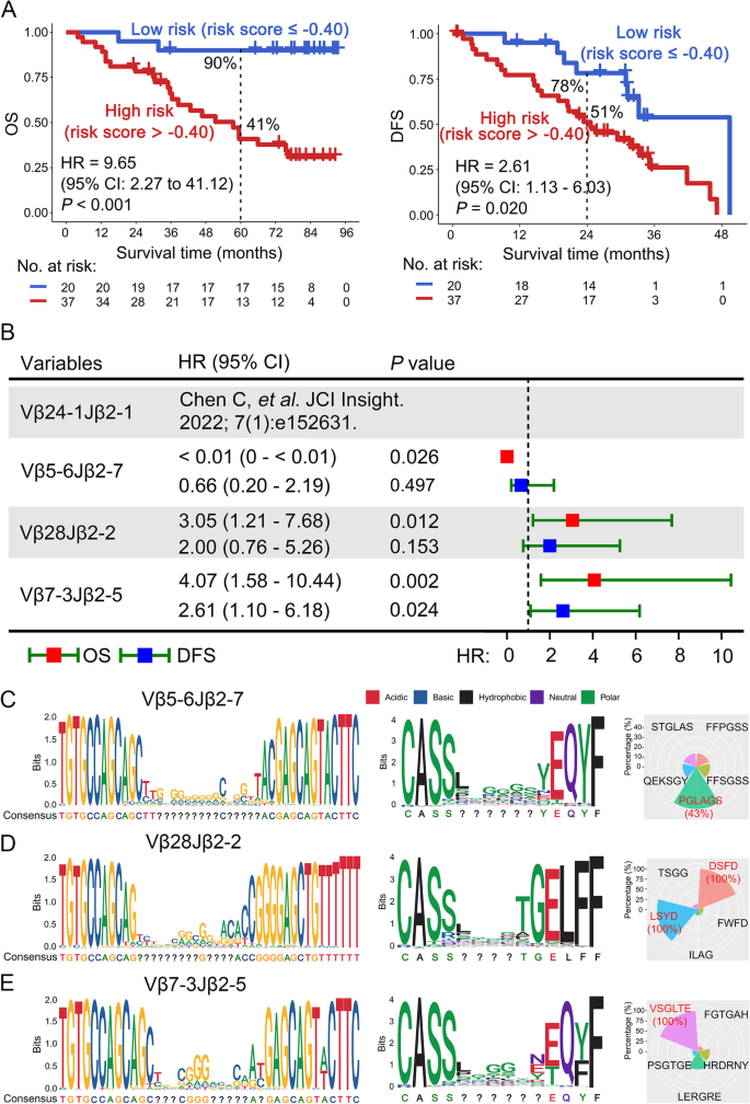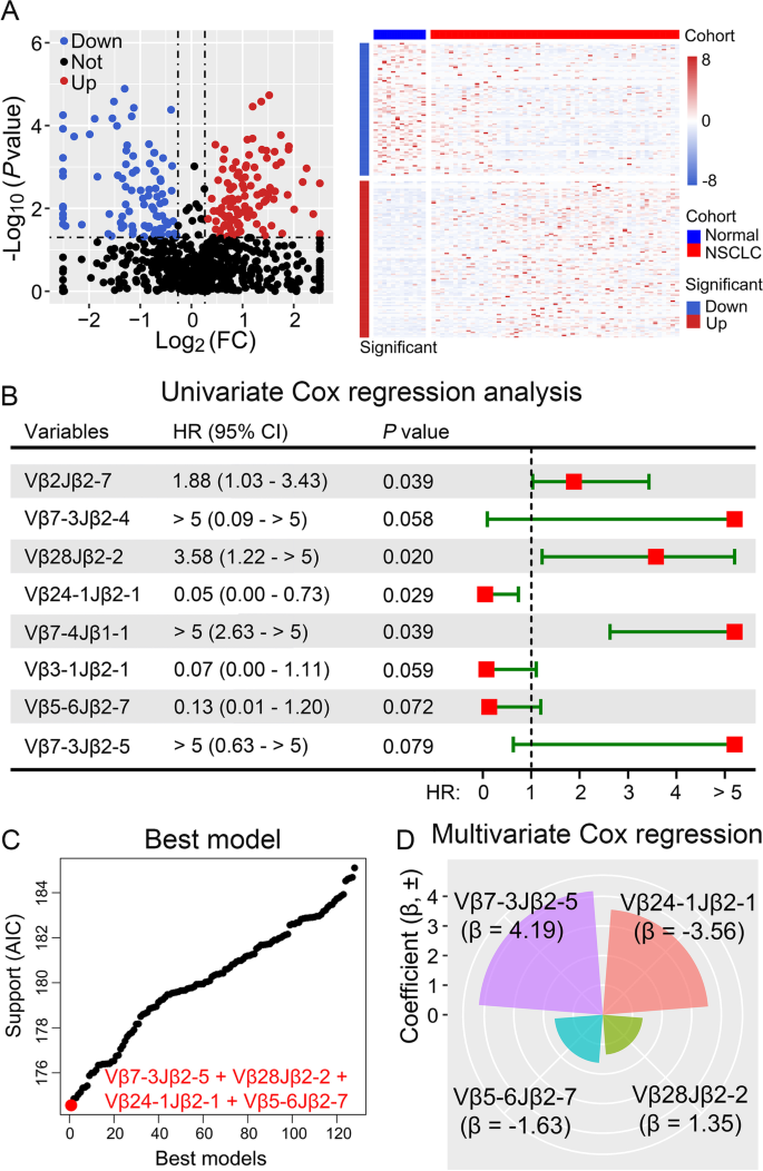 本环节的核心目标是筛选具有预后预测价值的TCR序列,并构建最优的组合预测模型。研究首先采用Mann-Whitney-Wilcoxon检验对比肿瘤组织与癌旁组织的TCR表达差异,鉴定出89个低克隆性、105个高克隆性的差异表达TCR;随后对高克隆性TCR进行单因素Cox回归分析,筛选出与总生存期(OS)相关的候选TCR(P<0.1);最后通过100次重复10折交叉验证,确定由高频率Vβ7-3Jβ2-5、Vβ24-1Jβ2-1与低频率Vβ5-6Jβ2-7、Vβ28Jβ2-2组成的组合模型为最优预测模型,该模型对OS的预测价值显著(P<0.001,风险比[HR]=9.65,95%置信区间[CI]:2.27至41.12)。