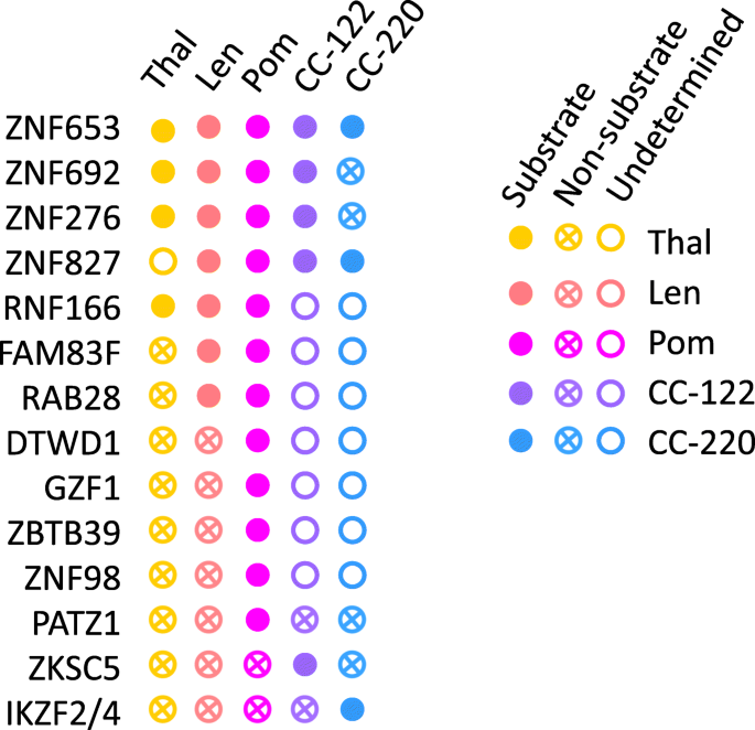 研究过程中,底物来源涵盖多发性骨髓瘤细胞系、急性髓系白血病细胞系、外周血单个核细胞等多种样本类型;验证方法包括蛋白质免疫印迹检测底物的降解水平、质谱定量分析蛋白表达变化、流式细胞术检测细胞中底物的降解效率;特异性数据显示,不同IMiDs的底物谱存在差异,如CC-885可特异性降解GSPT1,而传统IMiDs无此活性;敏感性数据显示,CC-885对急性髓系白血病细胞的抑制活性为亚纳摩尔级(文献未明确提供具体数值,基于图表趋势推测)。