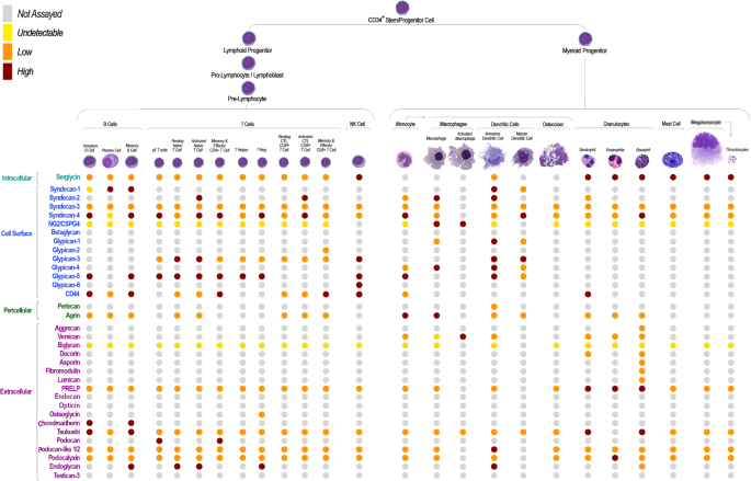 分别展示了正常造血系统中蛋白聚糖的转录模式和核心蛋白表达模式,其中CD44是各谱系造血细胞中广泛表达的“祖先型”蛋白聚糖,Serglycin在髓系分化中调控细胞颗粒形成,Syndecan家族参与造血细胞归巢与微环境交互;产品关联:文献未提及具体实验产品,领域常规使用转录组分析平台(如BloodSpot)、免疫组化(IHC)试剂、流式细胞术检测试剂盒等。