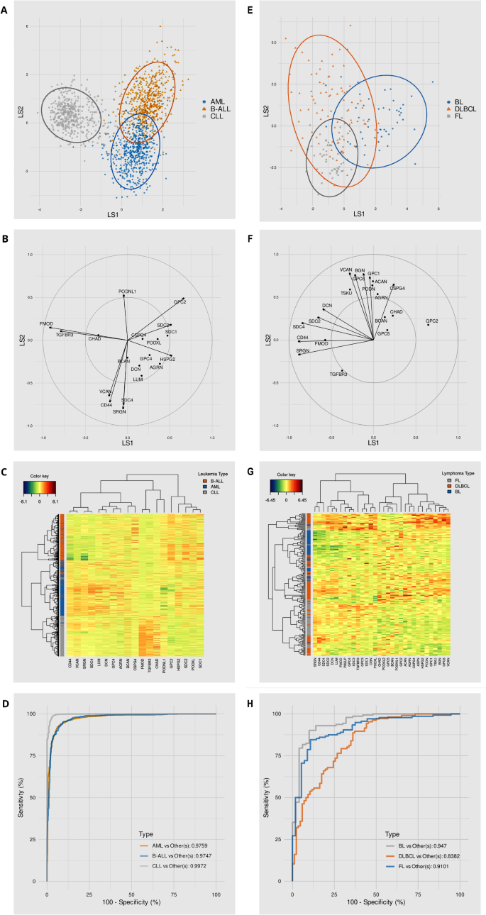 通过稀疏偏最小二乘判别分析(sPLS-DA)模型,显示蛋白聚糖转录组可区分不同白血病和淋巴瘤亚型,敏感性达90%;产品关联:文献未提及具体实验产品,领域常规使用基因测序平台、临床样本检测试剂盒、动物移植模型等。