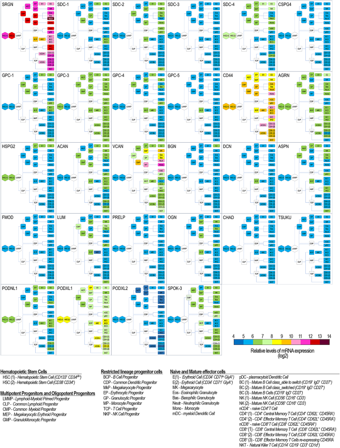 实验目的:明确蛋白聚糖的分类体系及其在正常造血中的基础调控作用;方法细节:整合已发表的蛋白聚糖分类研究(最新四分类法),结合BloodSpot数据库的正常造血转录组数据,梳理不同蛋白聚糖在造血干祖细胞、各谱系造血细胞中的表达模式;结果解读:
