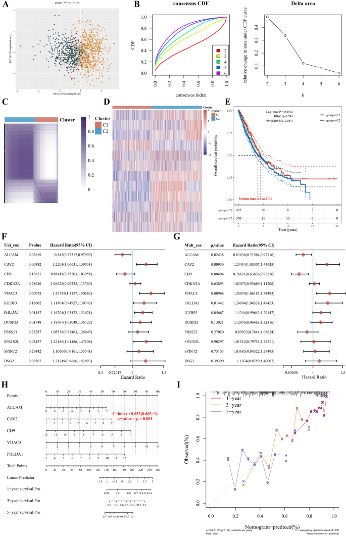 本环节的实验目的是建立NCS高低分组的预测模型,并分析核心基因与患者预后的关联。方法细节上,研究对高低NCS分组的差异基因进行最小绝对收缩和选择算子(LASSO)回归分析,筛选特征变量并通过R语言glm函数构建广义线性预测模型;基于The Cancer Genome Atlas(TCGA)和Gene Expression Omnibus(GEO)数据库,对12个核心基因进行Kaplan-Meier(K-M)生存分析,对LUAD患者进行一致性聚类分析和Cox回归,构建预后预测列线图。结果解读显示,研究筛选出22个特征变量构建预测模型,可有效区分NCS高低分组;CAV2、PHLDA1、ALCAM、CD9、IGFBP3、VDAC3与LUAD化疗患者的预后显著相关(P<0.05),其中CAV2、PHLDA1、VDAC3高表达患者的预后更差;一致性聚类分析将LUAD患者分为两个亚型,两组生存差异显著;多因素Cox回归显示ALCAM、CAV2、CD9、VDAC3、PHLDA1是LUAD患者的独立预后因素,基于这些因素构建的列线图C-index为0.652(95%CI 0.603-1),可预测患者1年、3年、5年的总生存。实验所用关键产品:siRNA(Ribobio)、Lipofectamine 8000(Beyotime)、CCK-8试剂盒(Dojindo)、EdU试剂盒(Sangon Biotech)、兔抗CAV2抗体(Abways,CY5010)、兔抗PHLDA1抗体(Abways,AY3597)、兔抗VDAC3抗体(Proteintech,55260-1-AP)、β-ACTIN抗体(Beyotime,AA128)。