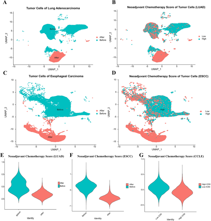 本研究的创新价值在于,首次结合肺腺癌(LUAD)和食管鳞癌(ESCC)患者新辅助化疗前后的单细胞测序数据,以及肿瘤细胞系的顺铂IC50数据,构建跨癌种的新辅助化疗评分(NCS),并建立对应的预测模型,同时在细胞水平验证关键调控基因的功能,弥补了传统组织水平研究忽略肿瘤细胞异质性的不足,为精准筛选铂类新辅助化疗获益患者提供了可验证的工具。