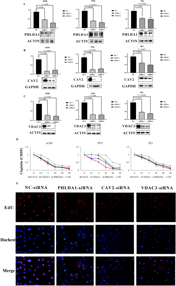 本环节的实验目的是验证CAV2、PHLDA1、VDAC3对肿瘤细胞顺铂敏感性的调控作用。方法细节上,研究在A549、PC9(LUAD)和TE1(ESCC)细胞系中,采用siRNA敲低CAV2、PHLDA1、VDAC3的表达,通过实时荧光定量PCR(qRT-PCR)和蛋白质免疫印迹(WB)验证敲低效率;采用CCK-8实验检测细胞在不同浓度顺铂处理后的活力变化,EdU实验检测细胞增殖能力变化。结果解读显示,siRNA敲低后,三个基因的mRNA和蛋白表达水平均显著降低(n=3,P<0.05);敲低CAV2、PHLDA1、VDAC3后,细胞对顺铂的敏感性显著增加,CCK-8实验显示细胞的顺铂IC50降低,EdU实验显示顺铂处理后的细胞增殖受抑制更明显(n=3,P<0.05)。实验所用关键产品:R语言glmnet包、forestplot包、rms包、K-M plotter在线工具。