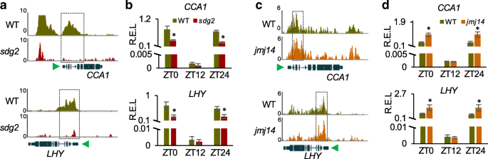 实验目的:验证组蛋白修饰酶SDG2和JMJ14的功能缺失是否影响核心生物钟基因的表达。方法细节:利用已发表的sdg2和jmj14突变体的染色质免疫沉淀测序(ChIP-seq)数据,分析核心生物钟基因(CCA1、LHY、TOC1等)的H3K4me3修饰水平变化;同时在16h光照/8h黑暗条件下,分别在ZT0、ZT12、ZT24取样,通过实时荧光定量聚合酶链反应检测突变体中CCA1和LHY的相对表达水平。结果解读:染色质免疫沉淀测序结果显示,sdg2突变体中CCA1、LHY等核心生物钟基因的H3K4me3修饰水平显著降低,对应实时荧光定量聚合酶链反应结果显示这些基因的表达水平也显著下调(n=3,P<0.05);jmj14突变体中,这些生物钟基因的H3K4me3修饰水平显著升高,对应基因表达水平也显著上调(n=3,P<0.05)。这一结果表明,组蛋白H3K4me3修饰直接调控核心生物钟基因的表达水平。实验所用关键产品:文献未提及具体实验产品,领域常规使用染色质免疫沉淀测序建库试剂盒、实时荧光定量聚合酶链反应相关试剂及组蛋白修饰抗体。