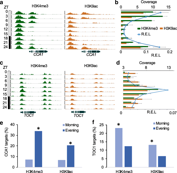 实验目的:验证核心生物钟基因的组蛋白修饰节律,并分析生物钟基因与节律性组蛋白修饰靶基因的关联。方法细节:通过染色质免疫沉淀测序数据分析核心生物钟基因(CCA1、LHY、TOC1、PRR5等)的H3K4me3和H3K9ac修饰的昼夜变化;同时利用已发表的CCA1和TOC1的染色质免疫沉淀测序数据,分析它们的靶基因与节律性组蛋白修饰的富集关联。结果解读:所有核心生物钟基因均具有H3K4me3和/或H3K9ac的节律性修饰,其中早晨相表达的CCA1在ZT0-ZT3出现H3K4me3和H3K9ac的修饰峰,傍晚相表达的TOC1在ZT12出现修饰峰,且修饰水平与基因表达水平高度正相关。关联分析显示,约33%的CCA1靶基因具有傍晚相H3K4me3修饰峰,20%具有傍晚相H3K9ac修饰峰(P<1e-50,超几何检验),与CCA1抑制傍晚相基因表达的功能一致;23%的TOC1靶基因具有早晨相H3K4me3修饰峰,13%具有早晨相H3K9ac修饰峰(P<1e-5,超几何检验),与TOC1调控早晨相基因表达的功能一致。这一结果表明,生物钟基因通过调控组蛋白修饰的节律性,实现对下游靶基因的昼夜表达调控。实验所用关键产品:文献未提及具体实验产品,领域常规使用染色质免疫沉淀测序数据分析软件(Bowtie2、MACS、JTK_CYCLE等)。