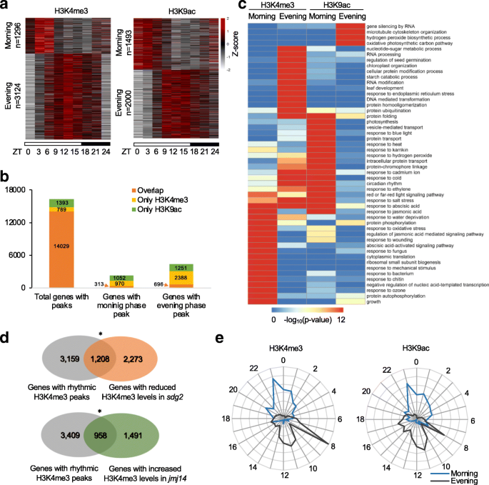 实验目的:解析拟南芥全基因组范围内H3K4me3和H3K9ac修饰的昼夜节律分布特征,以及与昼夜基因表达的关联。方法细节:选取3周龄拟南芥野生型植株,在16h光照/8h黑暗条件下,每隔3h取样一次(共8个时间点),通过染色质免疫沉淀测序检测全基因组H3K4me3和H3K9ac的分布;利用JTK_CYCLE算法分析具有昼夜节律性的修饰峰,采用k-medoids聚类分析修饰峰的相位分布,通过基因本体(GO)分析注释节律性修饰靶基因的功能;同时结合已发表的拟南芥昼夜表达谱数据,分析组蛋白修饰节律与基因表达节律的关联。结果解读:染色质免疫沉淀测序共鉴定到15151个高置信度H3K4me3峰和16966个H3K9ac峰,分别对应14818个和15422个独特基因;其中29%的H3K4me3峰和21%的H3K9ac峰具有显著的昼夜节律性(Padj<0.01)。相位分布分析显示,H3K4me3的节律峰主要集中在ZT12(中午),H3K9ac的节律峰主要集中在ZT15(下午);86%的靶基因同时具有H3K4me3和H3K9ac修饰,但只有13%的早晨相基因和22%的傍晚相基因同时具有两种节律性修饰,说明不同组蛋白修饰在昼夜基因表达中具有特异性作用。GO分析显示,早晨相修饰的基因富集于光合作用、胁迫响应等生物学过程,傍晚相修饰的基因富集于核酸代谢、蛋白折叠等过程。此外,约48%的节律性H3K4me3靶基因和47%的节律性H3K9ac靶基因具有昼夜表达节律,说明组蛋白修饰节律与基因表达节律高度相关。实验所用关键产品:染色质免疫沉淀测序使用NEBNext® Ultra™ II DNA Library Prep Kit for Illumina(NEB, Ipswich, Massachusetts),组蛋白修饰抗体为H3K4me3(Abcam; Ab8580)、H3K9ac(Abcam; Ab10812)。