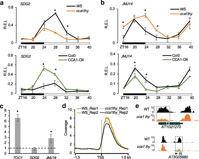 实验目的:验证核心生物钟振荡器CCA1/LHY是否参与组蛋白修饰酶SDG2和JMJ14的昼夜表达调控。方法细节:选取拟南芥野生型(Ws和Col-0)、cca1 lhy双突变体(Ws背景)、CCA1过表达株系(Col-0背景),在16h光照/8h黑暗的昼夜条件下,从ZT24(黎明)开始每隔4h取样,通过实时荧光定量聚合酶链反应(qRT-PCR)检测SDG2和JMJ14的相对表达水平;同时在ZT0(CCA1表达峰值时间点),利用染色质免疫沉淀-定量聚合酶链反应(ChIP-qPCR)检测CCA1蛋白与SDG2、JMJ14启动子的结合情况,以TOC1启动子为阳性对照,UBQ10为内参。结果解读:实时荧光定量聚合酶链反应结果显示,SDG2在野生型中白天(ZT28-ZT40)表达量显著高于夜间,cca1 lhy突变体中SDG2的表达水平显著下调(n=3,P<0.05),而CCA1过表达株系中SDG2表达显著上调(n=3,P<0.05);JMJ14的表达模式则相反,野生型中夜间(ZT40-ZT24)表达量更高,cca1 lhy突变体中JMJ14表达显著上调(n=3,P<0.05),CCA1过表达株系中表达显著下调(n=3,P<0.05)。染色质免疫沉淀-定量聚合酶链反应结果显示,CCA1在ZT0时能显著结合JMJ14的启动子(富集倍数为TOC1的80%左右,n=3,P<0.05),但不结合SDG2的启动子,说明CCA1直接调控JMJ14的表达,间接调控SDG2的表达。实验所用关键产品:实时荧光定量聚合酶链反应使用FastStart Universal SYBR Green Master(Roche, Indianapolis, Indiana),染色质免疫沉淀-定量聚合酶链反应使用CCA1抗体(Abiocode, R1234-3)。