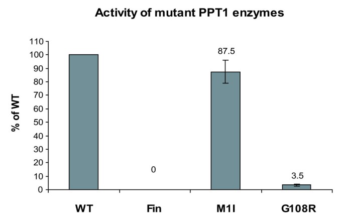 研究过程详述:Biomarker的来源为细胞表达的野生型和不同临床表型的突变型PPT1,验证方法包括:采用荧光底物法检测PPT1的酶活性,免疫印迹结合密度扫描定量分析糖基化程度,免疫共沉淀分析寡聚化能力,免疫荧光分析细胞内定位;特异性与敏感性方面,不同突变体的酶活性差异具有显著特异性,如成人型突变G108R的酶活性仅为野生型的4%,晚发婴儿型突变M1I的酶活性接近野生型;糖基化程度方面,经典婴儿型突变R122W和成人型突变G108R的三糖基化比例比野生型高10%(n=3,文献未明确提供P值),可有效区分突变体与野生型PPT1。