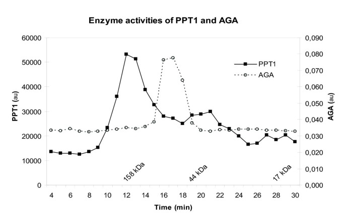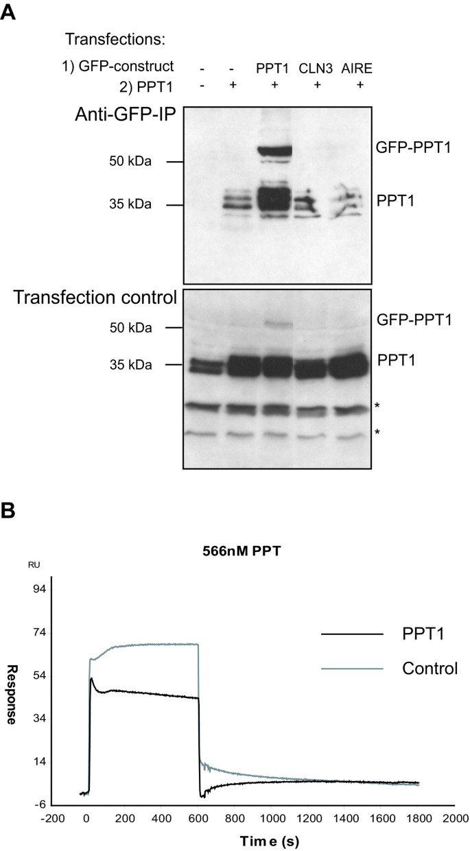 实验目的:探究PPT1在体内是否形成功能性复合物,明确其分子相互作用特性。方法细节:对PC12细胞的溶酶体富集组分进行Superose 6HR体积排阻色谱,收集各洗脱组分并检测PPT1和AGA的酶活性;在COS-1细胞中共转染GFP-PPT1与野生型PPT1、GFP-CLN3、GFP-AIRE(作为阴性对照),转染48小时后裂解细胞,用抗GFP琼脂糖珠进行免疫共沉淀,免疫印迹检测蛋白相互作用;通过Biacore表面等离子体共振技术分析纯化PPT1的直接相互作用。