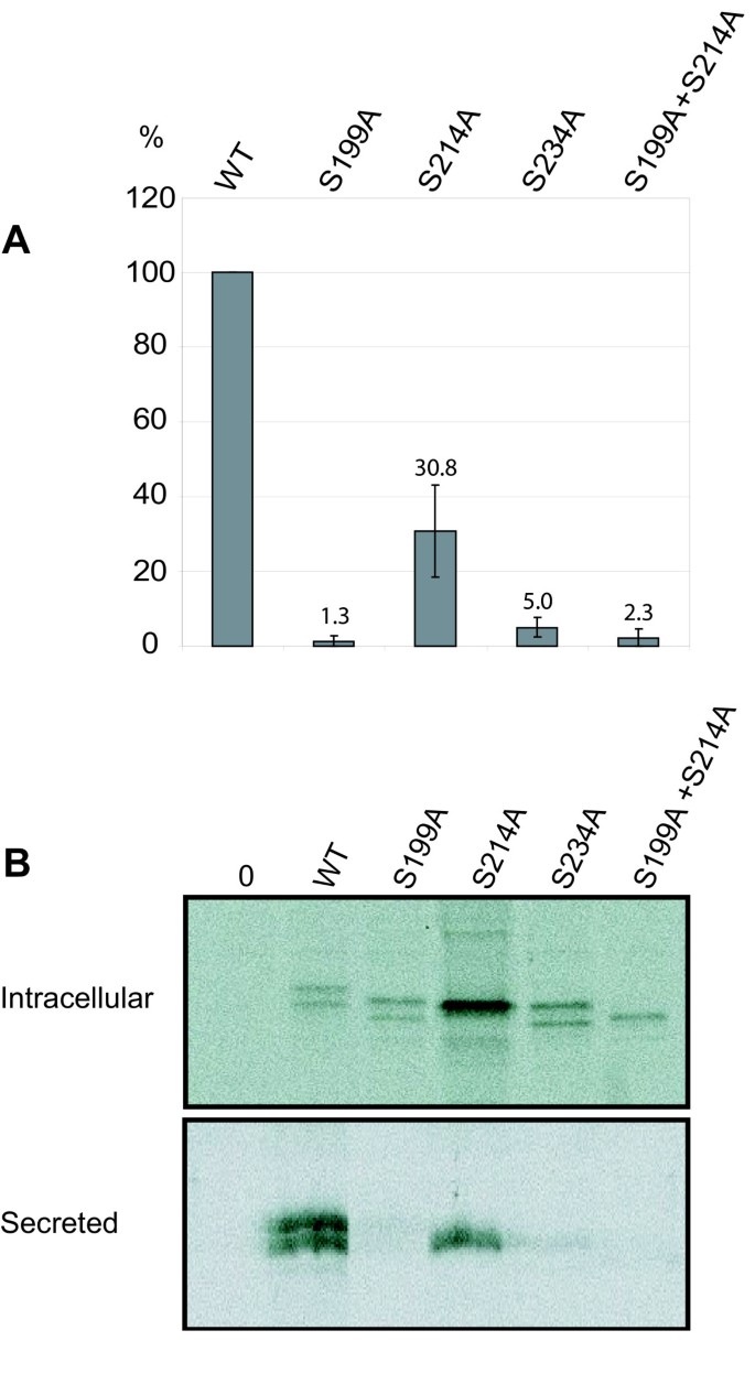 实验目的:明确PPT1的三个N-糖基化位点(N197、N212、N232)对其酶活性和细胞内转运的调控作用,避免之前突变策略对蛋白结构的干扰。方法细节:通过定点诱变将PPT1糖基化共有序列(N-X-S/T)中的丝氨酸突变为丙氨酸,构建S199A(对应N197位点)、S214A(对应N212位点)、S234A(对应N232位点)单突变体及S199A+S214A双突变体,将这些突变体及野生型PPT1转染至COS-1和HeLa细胞,转染48小时后裂解细胞,以总蛋白量标准化后检测PPT1酶活性;采用35S-半胱氨酸代谢标记1小时、 chase 2小时的方法,结合免疫沉淀分析PPT1的细胞内加工过程;通过免疫荧光染色结合溶酶体标记物LAMP-1、内质网标记物PDI,分析突变体的细胞内定位。