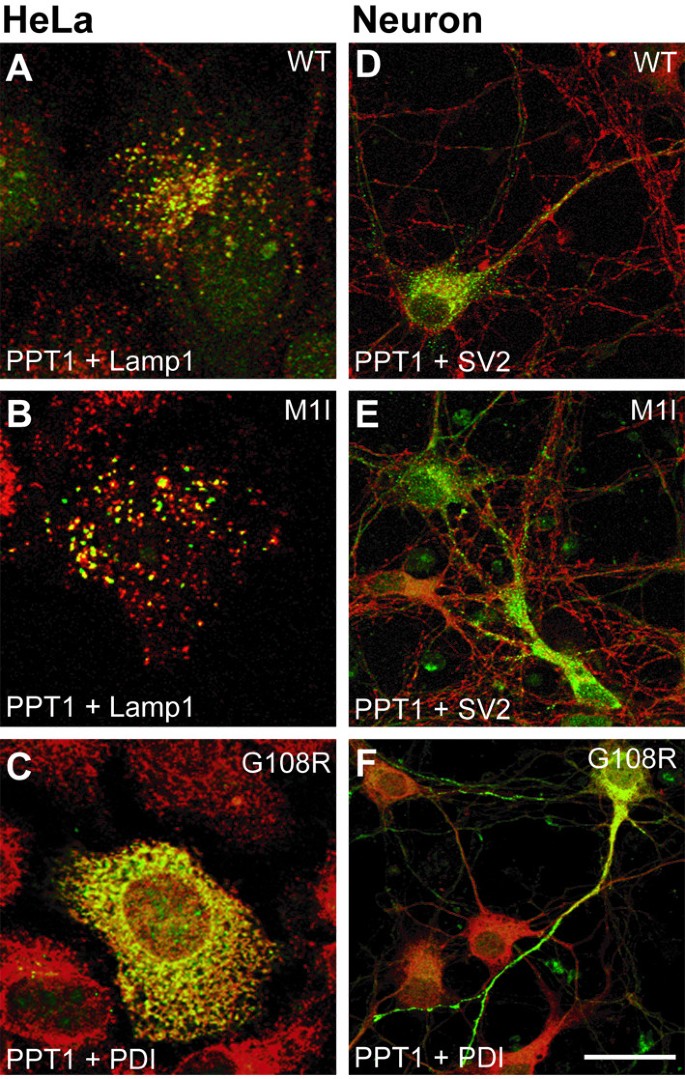 实验目的:分析不同临床表型的CLN1突变对PPT1酶活性、细胞内定位、糖基化程度及寡聚化能力的影响,明确基因型与表型的潜在关联。方法细节:构建携带M1I(晚发婴儿型)、G108R(成人型)、R122W(经典婴儿型)突变的PPT1表达载体,转染至COS-1细胞,转染48小时后裂解细胞,以蛋白表达量标准化后检测酶活性;在HeLa细胞和小鼠原代神经元中进行免疫荧光染色,结合LAMP-1、PDI、突触小体标记物SV2分析突变体的细胞内定位;提取转染细胞和病毒感染神经元的总蛋白,免疫印迹分析突变体的糖基化程度并通过密度扫描定量;在COS-1细胞中共转染突变型GFP-PPT1与对应突变型PPT1,免疫共沉淀分析寡聚化程度。