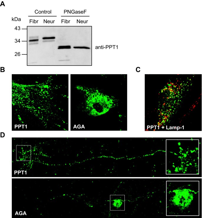 实验目的:系统比较神经元与非神经元细胞中PPT1的翻译后修饰和细胞内转运特性,明确细胞类型特异性差异。方法细节:用携带野生型PPT1的重组腺病毒感染小鼠原代成纤维细胞和神经元,培养4天后裂解细胞,取5μg总蛋白用PNGaseF处理去除N-糖链,通过SDS-PAGE和免疫印迹分析PPT1的修饰差异;采用抗体内化实验,将感染后的细胞与抗PPT1或抗天冬氨酰葡糖胺酶(AGA,经典溶酶体酶,作为对照)抗体共同孵育2小时,更换正常培养基继续培养2小时后固定,免疫荧光染色结合LAMP-1标记物分析抗体的内化定位。