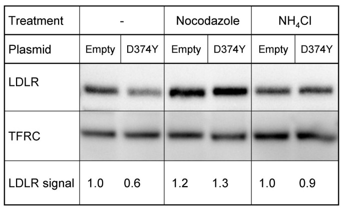 实验目的:解析PCSK9介导的LDLR降解所需的胞内运输及区室条件。方法细节:在HepG2细胞培养基中加入诺考达唑(20μg/ml,破坏微管)或氯化铵(10mM,升高酸性区室pH)预处理30分钟,随后更换含PCSK9及相应抑制剂的条件培养基继续孵育3小时,通过免疫印迹检测LDLR的含量变化。结果解读:免疫印迹结果显示,诺考达唑和氯化铵均可显著抑制PCSK9介导的LDLR降解(图7),说明LDLR的降解需要依赖微管的胞内运输,且发生在酸性胞内区室(如溶酶体)。产品关联:文献未提及具体实验产品,领域常规使用细胞抑制剂、免疫印迹抗体等。