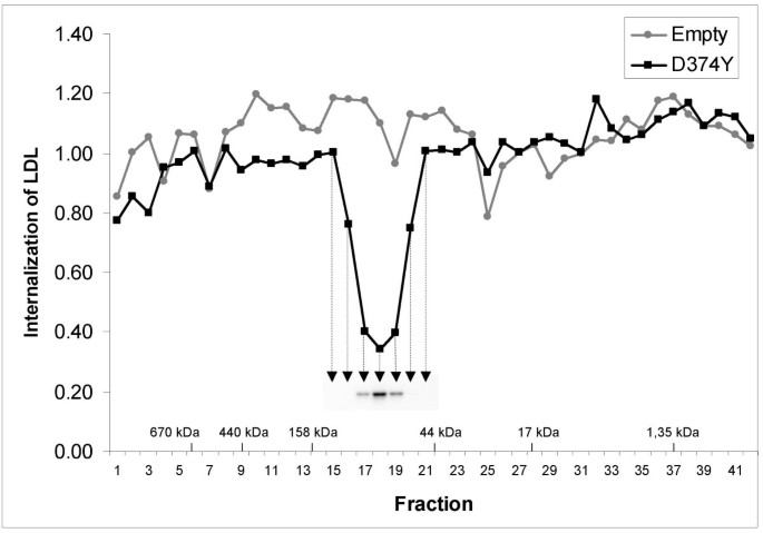 实验目的:进一步证实PCSK9自身介导LDLR降解,而非通过激活胞外其他蛋白。方法细节:将含D374Y-PCSK9-FLAG的条件培养基浓缩后,通过Superdex 200凝胶过滤层析分离为不同组分,收集各组分后孵育HepG2细胞,采用流式细胞术检测LDL内吞情况,同时通过免疫印迹检测各组分中PCSK9的含量。结果解读:组分18对LDL内吞的抑制作用最强,且该组分中PCSK9的含量最高,组分的分子流体力学体积对应约80kDa,与成熟PCSK9-前体复合物的分子量(约75kDa)接近(图3),说明LDL内吞抑制能力与PCSK9含量呈正相关,直接证明PCSK9自身是降解LDLR的效应分子,无需胞外中间蛋白参与。产品关联:文献未提及具体实验产品,领域常规使用凝胶过滤层析柱、免疫印迹抗体等。