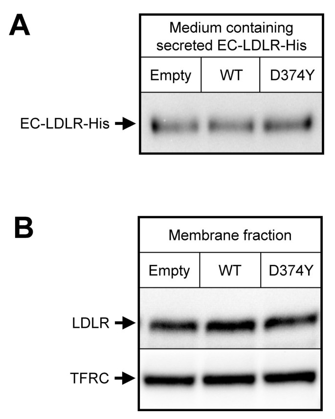 实验目的:明确PCSK9介导的LDLR降解是否发生在细胞表面。方法细节:构建缺乏胞质结构域和跨膜区的截短型LDLR(EC-LDLR-His),该蛋白可分泌至细胞外培养基;将浓缩的EC-LDLR-His与含PCSK9的条件培养基共孵育3小时;同时制备HepG2细胞膜组分,与含PCSK9的条件培养基共孵育3小时,通过免疫印迹检测LDLR的含量变化。结果解读:免疫印迹结果显示,无论是分泌型截短LDLR还是细胞膜组分中的LDLR,与PCSK9共孵育后含量均无明显降低(图4),说明PCSK9无法在细胞表面降解LDLR,需要完整细胞的胞内区室才能发挥降解效应。产品关联:文献未提及具体实验产品,领域常规使用质粒构建试剂盒、细胞膜分离试剂盒、免疫印迹抗体等。