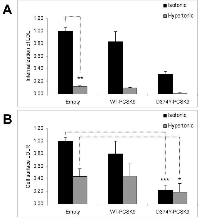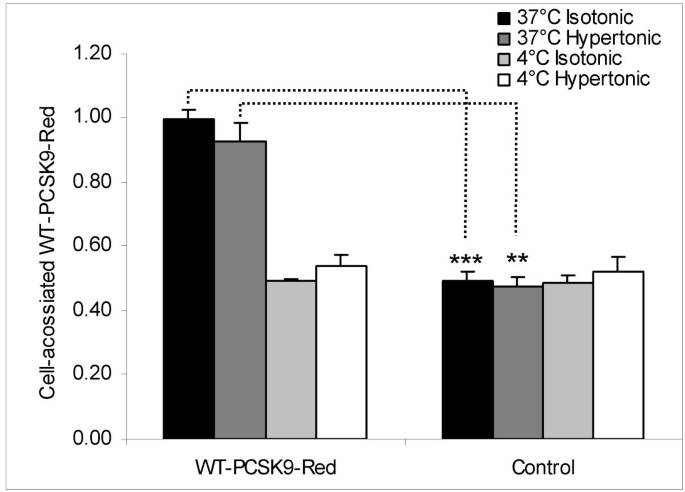 实验目的:验证PCSK9介导的LDLR降解是否依赖网格蛋白包被小窝介导的内吞途径。方法细节:在含PCSK9的条件培养基中加入NaCl使其高渗(终浓度增加150mmol/L),以快速可逆地阻断网格蛋白包被小窝的形成;将高渗条件培养基孵育HepG2细胞3小时,采用流式细胞术检测LDL内吞情况及细胞表面LDLR含量,同时检测红色荧光标记的PCSK9(WT-PCSK9-Red)的内吞效率。结果解读:高渗介质下,LDL的内吞被抑制至12%(n=3,P<0.01),但D374Y-PCSK9组的细胞表面LDLR仍显著低于空质粒组(n=3,P<0.05);WT-PCSK9-Red的内吞在高渗介质下略有降低但仍可进行(n=3,P<0.05)(图5、6),提示PCSK9介导的LDLR降解不依赖网格蛋白介导的内吞途径,PCSK9可通过非经典内吞方式进入细胞。产品关联:文献未提及具体实验产品,领域常规使用荧光标记试剂、流式细胞仪等。