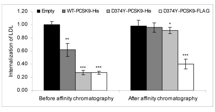 实验目的:验证PCSK9是否是条件培养基中唯一介导LDLR降解的因子,排除胞外其他分泌蛋白的参与。方法细节:将野生型(WT)PCSK9-His、功能获得性突变体D374Y-PCSK9-His及空质粒分别瞬时转染至HepG2细胞,24小时后更换无血清培养基,继续培养24小时收集条件培养基;采用镍螯合树脂亲和层析去除条件培养基中的PCSK9-His,通过免疫印迹(Western blot)检测PCSK9的去除效率,利用流式细胞术检测处理后的条件培养基对未转染HepG2细胞LDL内吞的影响。结果解读:免疫印迹结果显示,亲和层析可完全去除条件培养基中的PCSK9-His(图1);流式细胞术结果显示,含WT-PCSK9-His的条件培养基可抑制38%±10%的LDL内吞(n=4,P<0.01),含D374Y-PCSK9-His的条件培养基可抑制73%±3%的LDL内吞(n=4,P<0.0001);去除PCSK9后,两组的LDL内吞均显著恢复(P<0.05、P<0.001),而不结合镍树脂的D374Y-PCSK9-FLAG对照组内吞抑制无明显恢复(图2),提示PCSK9是条件培养基中唯一降解LDLR的因子。产品关联:文献未提及具体实验产品,领域常规使用转染试剂、免疫印迹抗体、流式细胞仪等。