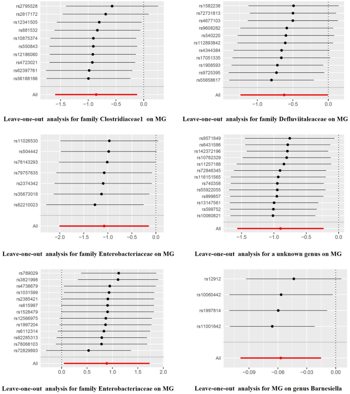 本研究中涉及的Biomarker为肠道菌群中的特定分类单元,包括Lachnoclostridium属、Clostridiaceae1科、Defluviitaleaceae科、Enterobacteriaceae科、未知属及Barnesiella属。筛选与验证逻辑为:基于大样本GWAS数据库筛选与肠道菌群/重症肌无力相关的遗传变异→通过孟德尔随机化方法验证遗传变异介导的菌群与重症肌无力的因果关联→多方法交叉验证+敏感性分析确认结果可靠性,形成完整的“筛选-验证-确认”链条。