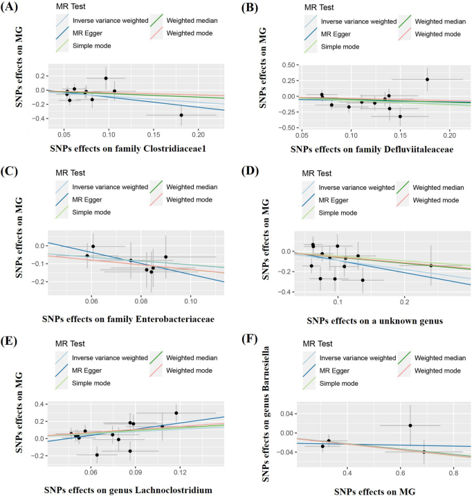 本环节核心目标是明确肠道菌群与重症肌无力的双向因果关联,采用多种孟德尔随机化方法交叉验证。正向分析中,以逆方差加权(IVW)法为主要分析方法,结合MR-Egger回归、加权中位数、简单模式、加权模式四种补充方法,结果显示Lachnoclostridium属与重症肌无力风险呈正相关(OR=2.431,95%CI 1.047-5.647,p=0.039),而Clostridiaceae1科(OR=0.424,95%CI 0.202-0.889,p=0.023)、Defluviitaleaceae科(OR=0.537,95%CI 0.290-0.995,p=0.048)、Enterobacteriaceae科(OR=0.341,95%CI 0.135-0.865,p=0.023)及1个未知属(OR=0.407,95%CI 0.209-0.793,p=0.008)与重症肌无力风险呈负相关;反向分析中,IVW法显示重症肌无力与Barnesiella属丰度呈负相关(OR=0.945,95%CI 0.906-0.985,p=0.008),所有补充方法均得到一致结果,因果关联的散点图如图2所示。