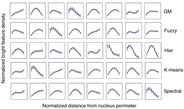 作者首先对传统乳腺组织学诊断方法进行评述,指出这类方法依赖病理学家的主观判断,基于细胞与组织的宏观形态特征,虽能满足基础诊断需求,但无法提供亚细胞层面的定量信息,难以实现早期肿瘤的精准检测与分型。随后,作者梳理了核蛋白分布与细胞表型的关联研究,已有结论表明核有丝分裂装置蛋白等染色质相关蛋白的核内分布模式与乳腺上皮细胞的增殖、分化状态直接相关,非肿瘤性细胞在完成腺泡形态发生过程中,核有丝分裂装置蛋白会从细胞核内的弥散分布逐渐聚集为灶状结构,而恶性细胞中核有丝分裂装置蛋白始终呈弥散分布,同时已有研究开发了LBF分析技术来量化这种分布特征,但未建立与细胞表型的统计关联。针对聚类分析方法,作者将现有方法分为传统单一聚类方法与集成聚类方法,传统方法包括K-means、模糊C均值、高斯混合模型、层次聚类及谱聚类等,这类方法各有适用场景,如K-means计算效率高,模糊C均值可处理重叠聚类,但不同方法基于不同的数据分布假设,导致对同一数据集的聚类结果一致性较低,成对F-measure值多在0.45至0.63之间,鲁棒性不足;集成聚类方法虽已被提出,但其在生物医学图像数据尤其是核蛋白分布表型分析中的应用尚未见报道。通过对比现有研究的局限性,本研究的创新价值凸显:首次将概率集成聚类方法应用于核蛋白分布数据的分析,解决了单一聚类方法结果不稳定的问题;构建了层次化的表型树并量化了不同表型分组的统计显著性,实现了核蛋白分布特征与细胞表型的可靠关联,填补了该领域的技术空白。